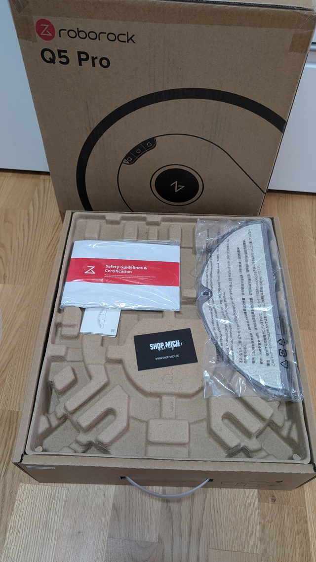 Verpackung ist geöffnet. Der ROBOROCK Q5 Pro ist ein leistungsstarker Saug- und Wischroboter, der für eine gründliche und effiziente Reinigung Ihres Zuhauses entwickelt wurde. Er kombiniert hohe Saugkraft mit einer praktischen Wischfunktion, um sowohl Staub als auch leichten Schmutz zu beseitigen und Ihre Böden makellos sauber zu halten.